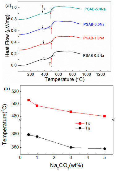Figure 3a shows the DTA traces of PSAB glasses, dependent on Na2CO3 concentration. Figure 3b shows the quantitative values of Tg and Tx as a function of Na2CO3 dopant concentration. As Na2CO3 dopant concentration increased up to 5 wt%, the Tg and Tx decreased from 380 to 360 °C, and 510 to 480 °C, respectively. The ΔT remained almost unchanged regardless of Na2CO3 dopant concentration. The higher the value of ΔT, the greater the delay in the nucleation process, the greater the thermal stability, and the easier the glass formation [23]. A similar effect was observed in sodium silicate glasses and borate glasses when Na2O was added to the glass [22,24]. The constant of ΔT regardless of Na2CO3 dopant concentration indicated that there was no big difference in the nucleation process. Therefore, it was thought that the decrease of Tg in this work was mainly due to the formation of nonbridging oxygens.