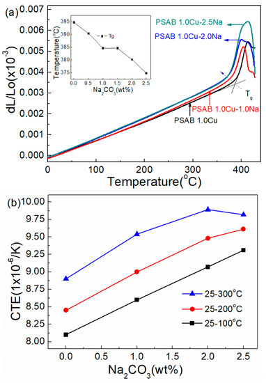 From Figure 2, it was found that the significant difference of CTE between 1 wt% CuO doped PSAB glass and the FTO coated glass panel was 2 × 10−6/K. In order for the CTE difference to be below 1 × 10−6/K, the optimization of composition is needed. It is basically well known that the addition of Na2O in the silicate network provides nonbridging oxygens and thus decreases the Tg [22]. However, when the Na2O content was more than 6 wt%, it was reported that the chemical stability becomes deteriorated [23]. Therefore, we prepared a PSAB glass system doped with Na2CO3 concentration varied in the range of 0.5–5 wt% and studied its effect on Tg, Ts, and CTE.