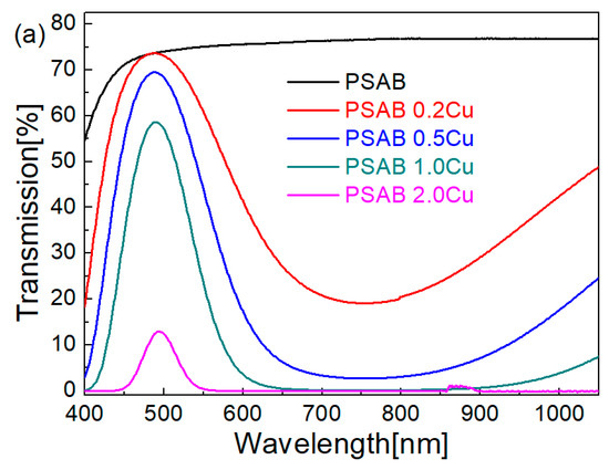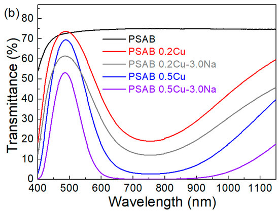 In order to investigate the absorption at 810 nm, the transmission spectra of CuO-singly doped and CuO-Na2CO3 codoped PSAB glasses are shown in Figure 5. Figure 5a presents the transmittance spectra of CuO-doped PSAB glasses in the region 300–1100 nm for different concentrations of CuO. From the spectra, the bands at 500 and 810 nm are assigned to the Cu2+ transitions of 3d10 → 3d9 4s1 and 2B1g → 2B2g, respectively [25,26]. In the base PSAB glass system, the average transmittance between 500 and 1100 nm was about 70%. As CuO concentration increased, the transmittance decreased because of the UV absorption edge. The transmittance at 810 nm for 0.2 wt% and 0.5 wt% CuO-doped PSAB glasses was found to be 20.7% and 3.19%, respectively. For 1 wt% CuO, the transmittance was not observed at 810 nm. This result revealed that the absorption intensity and broadening at 810 nm increased with increasing CuO concentration. The broadening of this band may be ascribed to the superposition of three electron transition in ‘d’ orbitals corresponding to the 2B1g → 2Eg, 2B1g → 2A1g, and 2B1g → 2B2g transitions of Cu2+ ions.