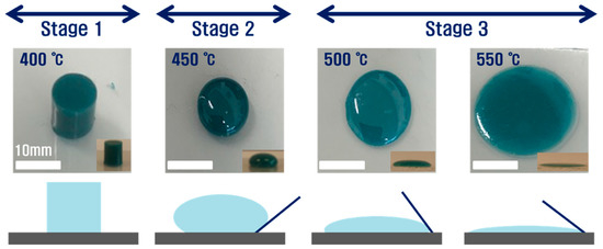 As shown in Figure 6, the flow button test showed the shapes of pellets as a function of sintering temperature at (a) 400 °C, (b) 450 °C, (c) 500 °C, and (d) 550 °C. Height and diameter of pellets were measured as a function of sintering temperature. The wetting angle of the pellet was divided into three stages as shown in Figure 6. At the first stage, a cylinder type of pellet was sintered at 400 °C for 30 min, and the volume of the pellet decreased by 23% to reduce the surface energy. The Tg of PSAB glass frit was 390 °C, as shown in Figure 2. It could lead to a reduced volume of pellet due to the rearrangement and densification of the glass frits with square shape. At the second stage, the square types of pellet changed to swollen sphere after being sintered at 450 °C for 30 min. It indicated that flow ability is enough for laser sealing at this temperature, which is above the softening temperature of 430 °C as shown in Figure 2. In this stage, the wetting angle of the molten glass was >90°. At the third stage, the wetting angle of the molten glass started to show <90° at 500 °C. It was found that the molten glass spread over FTO coated glass due to viscous flow above 550 °C. Finally, it was confirmed that the flow ability was found to be good for laser sealing in the temperature range of 400–430 °C, which is above the softening temperature of 430 °C, as shown in Figure 2.