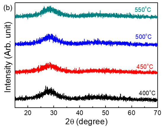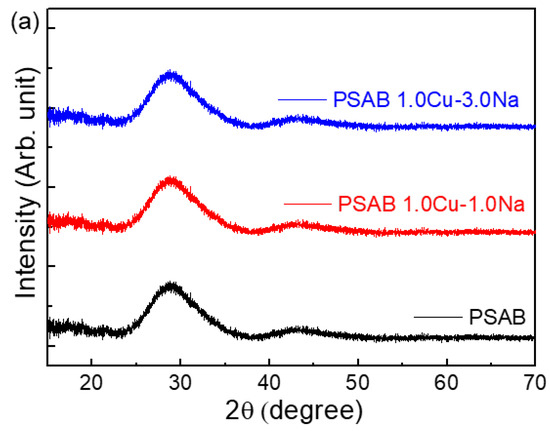 (a) XRD spectra for base PSAB system, 1 wt% CuO-doped, and 1 wt% CuO and 2 wt% Na2CO3 codoped PSAB glass systems; (b) XRD spectra for codoped PSAB glass system sintered at 400–550 °C.