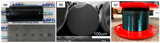 (a) Glass ingot; (b) microscope image of glass fiber with 180 μm diameter; and (c) glass fiber spool of 1 wt% CuO-2 wt% Na2CO3 codoped PSAB system.