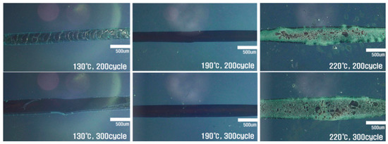 In order to optimize the laser sealing process, the microscopic photos of different stages are shown in Figure 9 as a function of sealing cycle and plate temperature. In the reference study [32], Cho et al. reported that screen printed glass frit based on V2O5 and TeO2 glass had a thickness of ~20 μm and width of 700 μm. It was found that the optimized laser sealing conditions were under laser power of 40 W, laser scan velocity of 300 mm/s, and laser scanning cycle of 200. Compared to the above study, two parameters were modified in the present investigation because the fiber type of sealant had a 180 μm diameter. First, the glass substrates were thermally treated in the temperature range of 130–220 °C for 30 min using hot plates in order to reduce thermal shock after the laser sealing process. Secondly, laser scan velocity was reduced to 40 mm/s after fixing laser power of 35 W. The fiber sealant was not melted at all in the microscopic photos when the glass substrate was below 100 °C, until the laser scanning cycle of 200, and then it looks like delamination. The fiber sealant started to melt when the glass substrate was at a temperature of 130 °C with a laser scanning cycle of 200. However, it has thermal stress cracks. When two FTO glass substrates were heated at 190 °C, the fiber sealant was completely melted at a laser scanning cycle of 200–300, showing crack free surface. The fiber sealant was melted and aggregated showing a sphere type of island of glass molts (pores) regardless of laser scanning cycle of 200–300 after two FTO glass substrates being heated at 220 °C. It was found that two FTO glass substrates using the glass fiber were successfully sealed under laser power of 35 W, laser scan velocity of 40 mm/s, laser scanning cycle of 200–300, and a preheating of 190 °C, resulting crack free surface.