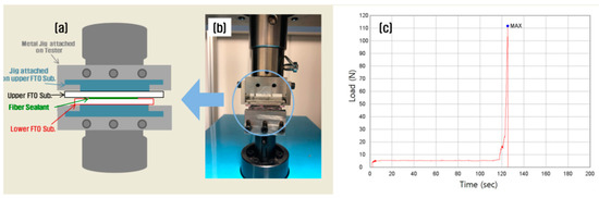 Figure 10a shows a schematic diagram of jig mounted FTO substrates. Figure 10b depicts a universal tensile tester mounted with jig to investigate the laser sealing quality. The strength tests are essential to assess the mechanical resistance of the devices. The laser-sealed FTO substrates with fiber sealant were subjected to mechanical strength using equipment comprising of two stainless steel jigs up and down. Figure 10c shows tensile load changes with time for the laser-sealed FTO substrates using fiber type sealant. It can be observed from Figure 10c that under laser power of 35 W, laser scan velocity of 40 mm/s, laser scanning cycle of 200, and a preheating of 190 °C, uniform relative movement occurred to the fiber sealant and FTO substrates with the testing machine, which had a uniform linear motion, until the breaking force reached the maximum value, at which time the relative displacements of the sealant and FTO substrates were small. The fracture failure mode is ductile fracture, since the fracture of the laser sealing is flush and bright and perpendicular to the direction of the normal stress. The results showed that the maximum load that the samples can withstand is 110 N. This means that the fiber sealant can withstand to a strength of 41 MPa. Sealing stress was not measured on laser-sealed FTO substrates thermally treated at 130 and 220 °C due to defects of delamination and aggregation. It was found that the maximum value of the breaking force was reached after a certain displacement between upper FTO substrate and lower FTO substrate was formed. In the previous studies, it was reported that sealing strength using screen printed sealant was observed in the range of 12.3–20.5 MPa [3,33]. Compared with values obtained from previous studies above, a sealing strength of 41 MPa seemed to be as strong a candidate as laser sealant.