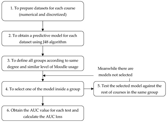 - In each experiment, each model is selected (step 4) and tested against the rest of the datasets of courses belonging to the same group (step 5), repeating this process for each course.