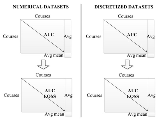 In this section we show the results obtained from the two sets of experiments carried out. We present the AUC and the loss of AUC in four different matrixes (two for numerical datasets and two for discretized datasets) for each group of similar courses (see Figure 2). In the upper part, we show two matrixes containing the AUC metric values that we have obtained when testing each course model (row) against the rest of the courses datasets (columns) using the numerical and the discretized datasets. The matrix main diagonal values correspond to the tests carried out for each course model against its own dataset, which means those AUC values (the highest ones) constitute the reference value (in green color) when compared with the rest of the courses. We have also calculated the average AUC values for each course (column denoted as “avg” in the tables) and the overall mean value for the group (cell denoted as “avg mean” in the tables). In the lower part, we show two matrixes showing the difference values between the highest AUC (row), which is considered to be the reference value, and the AUC values obtained when applying the corresponding model to each of the rest of the courses in the same group (column) using the numerical and the discretized datasets. Finally, our analysis focused on finding the best or highest AUC values and the best or lowest rates of AUC loss in each group of similar courses. Thus, we highlighted (in bold) the highest AUC values (without considering the reference value) and the lowest AUC loss values, which will represent the lowest portability loss, and thus the best results.