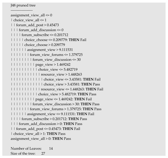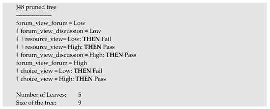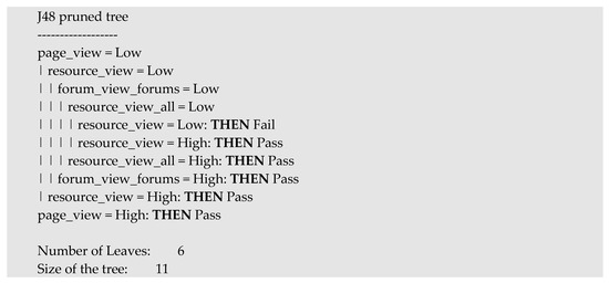 In Figure 5, we show the best decision tree in the medium level group with numerical datasets, that is, the prediction model of the Ins course. It is a medium size tree (15 nodes in total) that has three rules or leaf nodes for Pass class and five rules for Fail. The attributes or events that appear in this tree are about forum, page, and choice. Most of the branches that lead to Pass show that students must have a greater number of events in these attributes than a specific threshold. The rest of paths lead to students’ fail.