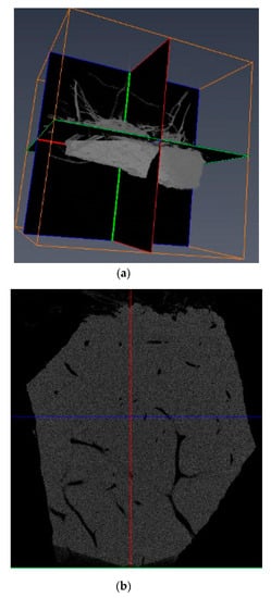 Computed tomography and a coconut shell specimen. (a) Perspective view; (b) A horizontal cross-section.