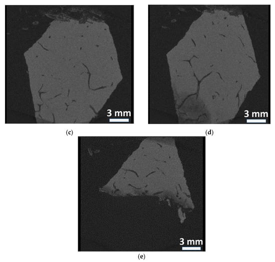 Horizontal (x-y plane) cross-sections of a coconut shell. (a) Top surface; (b) Horizontal middle 1; (c) Horizontal middle 2; (d) Horizontal middle 3; (e) Bottom surface.