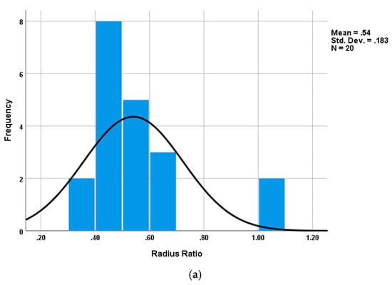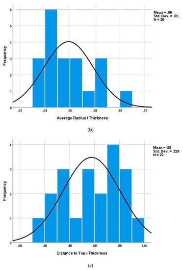 Statistical characteristics of microchannels of a coconut shell with a thickness of 2.88 mm (dimensions of the coconut shell specimen in x, y, and z: 18.6 mm, 18.98 mm, and 18.9 mm). (a) Radius ratio; (b) Average radius/thickness; (c) Distance to top/thickness.