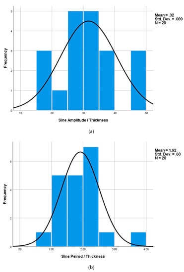 Additional statistical characteristics of microchannels in the form of a sine curve. (a) Sine amplitude/thickness; (b) Sine period/thickness.