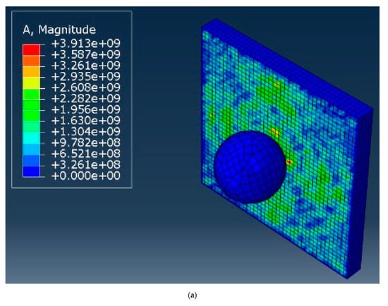 A pendulum impact test is established, as shown in Figure 11. The steel ball has a reference point as its rotational center. The displacements at the boundaries of a plate are fixed along all three coordinate directions as well as three rotational directions. The plate is oriented with its surface normal pointing horizontally. We consider a generic material for the plate with Young’s modulus = 70 GPa and Poisson’s ration = 0.34. The exact values of material parameters are not important here, because we are only interested in a comparison of impact performance. The steel ball is 45 degrees from the plate, with its initial angular velocity = 750 radians/second and its weight = 1.5 kg.