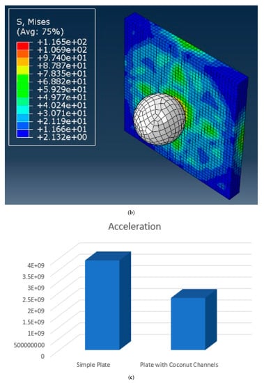 Comparison between a coconut-inspired plate and a regular plate with respect to impact performance. (In the scientific notation, 3.913e+09 or 3.913E+09 represents 3.913 × 109; other floating values follow the same rule.) (a) Distribution of acceleration (; (b) Distribution of von Mises stress (); (c) Acceleration reduction.