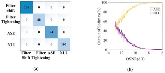 The identification results are shown in Figure 5a. The results demonstrate a high accuracy of the proposed method when there exists only one type of anomaly. In the scene when multiple types of anomalies exit, the probability output by the SoftMax layer is utilized to gain insight into their respective influences on the system. The result is shown in Figure 5b. The influences of ASE and nonlinear interference (NLI) on the system are similar at first since the output probabilities of the two causes are both about 50 percent. Then, with the OSNR increasing, the NLI gradually becomes the dominant cause.