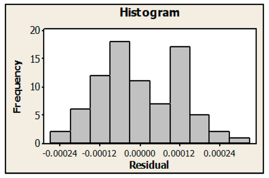 Before moving to the implementation of the ANOVA for this study, it was first necessary to determine if the ordinary least squares assumptions for all analyzed variables of Equation (1) were being met, i.e., homoscedasticity, normality, and independence. These assumptions are verified through the residual plots that are presented below. As an example, the behavior of the assumptions in the variable parallelism will be explained in detail. The residual histogram is an exploratory tool to prove the general characteristics of the data. Figure 4 shows that the data is not skewed and there are no outliers.
