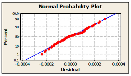 The normal probability plot of the residuals for this experiment is shown in Figure 5. The points in this plot represent a straight line that verifies the assumption that the residuals are normally distributed.