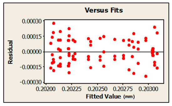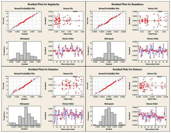 In the same way, the fulfillment of the assumptions was verified in the rest of the variables analyzed (angularity, roundness, diameter, and distance); these plots are all shown in Figure 8. Notice, however, that the software does allow adding units to the plots between Figure 4 and Figure 7 given that this is not considered necessary; however, for the sake of comprehension, the authors did want to specify this on the residual versus fits plot.