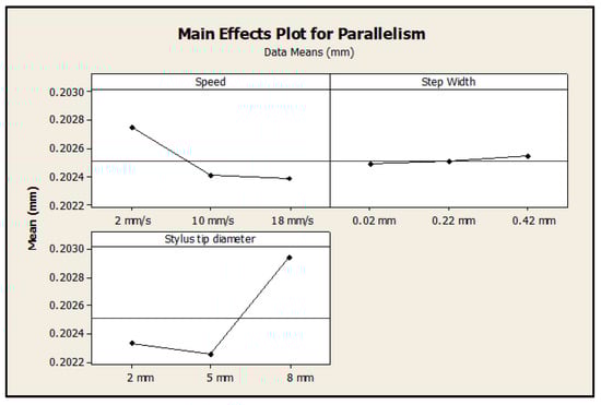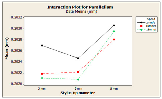 On the other hand, Figure 10 shows the interaction between the factors Stylus diameter and Speed on the variable parallelism as an illustrative example. This was selected because it was statistically significant in the 95% confidence interval in the ANOVA table. The significant interaction is indicated by the lack of parallelism of the lines. In general, the behavior of the average varies depending on the interaction of both factors implying that when the measuring Speed is the same, different values will be obtained depending on the Stylus diameter these are measured with. For example, maintaining a constant Speed of 18 mm/s and varying the Stylus diameter from 2 mm to 8 mm yields a measurement value that differs in up to 8 µm with respect to the initial Stylus diameter level. At the same time, when using the same Stylus diameter, e.g., 2 mm, it is possible to see how changing the Speed of the measurement leads to obtaining three different values that range from 0.2021 mm to 0.2027 mm.