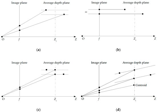 In the paraperspective, as shown in Figure 3d, object points in space are projected to the average depth plane (parallel to the image plane) following a direction parallel to the line that passes through the object’s centroid and the camera optical center.