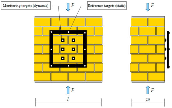 In the proposed approach, a measurement referential composed of reference targets is placed in front of the observation region in the masonry specimen (with length l and width w) at the minimum reasonable distance from the specimen surface in order to minimize the observation depth difference to the monitoring targets fixed and scattered in the observation region (in the inner region of the referential), as shown in Figure 4.