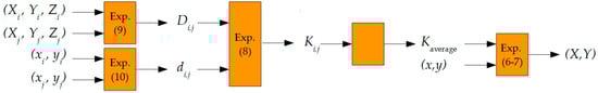 where i = j = 1, 2, …, n, with i ≠ j and n being the total number of reference targets in the referential, and Di,j and di,j are, respectively, the distances between the two targets i and j in the world and in the image coordinate system, i.e.,