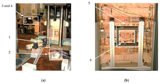 The implemented optical measuring system for the masonry specimen testing setup is presented in Figure 6. In this figure, the main elements are numbered and described as follows:
