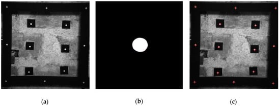 Target digital image processing: (a) original image; (b) binary image for one of the targets; (c) image with centroids.