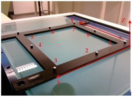 The image digital processing was supported in a computational routine developed in MATLAB® (MathWorks, Natick, Massachusetts, USA), aiming at the determination of image coordinates of the geometrical center of both the reference and monitoring targets. In the case of the reference targets, the adopted target identification convention was a numerical sequence between one and eight, starting in the target located in the image upper left corner and following a clockwise direction for the following targets located in the measurement referential (see Figure 7a). For the case of the monitoring targets (located in the inner region of the measurement referential, as shown in Figure 7a), the mentioned numerical sequence was extended to these targets, continuing with the monitoring target located in the upper left corner of the referential inner region and following the clockwise direction for the remaining targets.