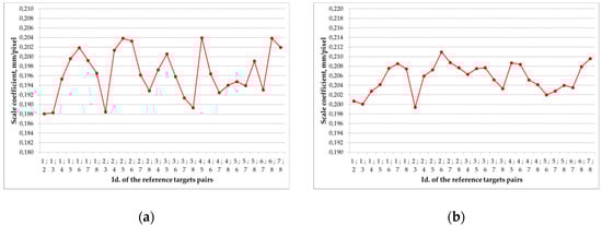 Since the measurement referential can have several pairs of reference targets, an average value of the scale coefficient and the correspondent standard deviation of the experimental sample can be obtained. This calculation procedure (represented in Figure 5) contributes to the reduction of the scale coefficient measurement uncertainty components related to the effect of the lens distortion and planar misalignments between the specimen surface, the measurement referential, and the image plane.