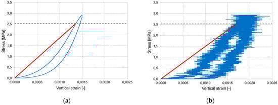 In general, these contact sensors are connected to a data acquisition system that provides electrical power and is responsible for the conditioning and processing of the electrical signals received. The existence of multiple measurement chains and the dynamic nature of the testing activities also imply the use of a synchronization signal generator. The collected data allows quantifying the relation between stress and the dimensional quantities (displacement or strain) in regions of interest in the tested specimen, namely in its central area, from which several mechanical properties can be obtained and used for its characterization, namely, the compressive strength, σ, the modulus of elasticity, E, and the Poisson ratio, υ, which are, respectively, determined by the following expressions: