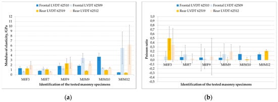 Based on the calibration certificate of the used universal testing machine, the compression force expanded measurement uncertainty, considering a 95% confidence interval, which corresponded to 0.53% of the force estimate value, in the measurement interval comprised between 300 and 3000 kN. This Gaussian dispersion value reflects both the measurement uncertainty component related to the applied calibration force and to the force measuring chain of the testing machine, namely, reproducibility, repeatability, interpolation, zero deviation, reversibility, and creep measurement uncertainty components. Table A3 shows the obtained maximum load force estimates and standard measurement uncertainties for several tested masonry specimens.