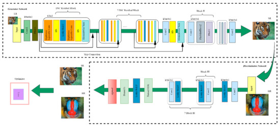 Single image super-resolution (SISR) reconstruction is the development of high-resolution (HR) images with richer details and clearer texture from low-resolution (LR) images or degraded images and has wide applications in the field of image processing [1,2,3,4,5]. At present, reconstruction techniques are divided into three main categories: interpolation-based, reconstruction-based, and learning-based methods. The interpolation reconstruction method proposed here includes nearest interpolation, bilinear interpolation, and bicubic interpolation. Further proposed reconstruction-based methods are iterative back projection (IBP) [6], projection onto convex sets (POCS) [7], and maximum a posteriori (MAP) [8]. Some learning-based methods have been proposed, including the early collar neighbor embedding (NE) [9] algorithm and the sparse representation-based classification algorithm [10]. Deep resolution reconstruction methods based on deep learning are gaining more attention. The super-resolution convolutional neural network (SRCNN) [11] algorithm introduced deep learning methods to SISR for the first time. In order to improve the network convergence speed of SRCNN, accelerating the super-resolution convolutional neural network (FSRCNN) [12] was developed. Efficient sub-pixel convolutional neural network (ESPCNN) [13] was also proposed to further improve the efficiency of computation. In order to further recover the high-frequency detail of images, Yang [14] et al. proposed a deep learning method called data-driven external compensation guided deep networks for image superresolution. Traditional deep learning methods can optimize image quality by making the network structure deeper, to obtain more image features. The introduction of generative adversarial networks (GAN) [15] is a new direction for SISR.