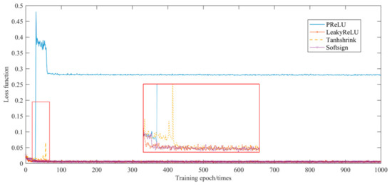 The DSC Dense Block performs feature extraction and representation in the generator network. The activation function affects the convergence speed, stability, and quality of the generated image. Therefore, different activation functions can be chosen to build the DSCSRGAN to train and test on the DIV2K dataset, including PReLU, LeakyReLU, Tanhshrink, and Softsign. Experimental results showed that a network model using LeakyReLU as the activation function had faster convergence and better network stability in the early stage. The results are shown in Figure 3.