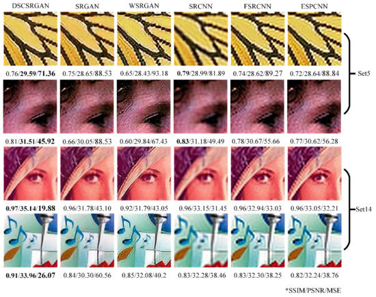 Five reconstruction algorithms based on learning and DSCSRGAN were selected to perform image reconstruction tests on the Set5 and Set14 datasets. The objective evaluation index average PSNR and average SSIM were calculated. The objective indices were better than those generated by the other algorithms. In Set5, PSNR and SSIM enhancements reached 3.3 dB and 15.97%, respectively. For the Set14 dataset, the PSNR increased by 3.1 dB, and the SSIM increased by 16.46%, as shown in Table 2.