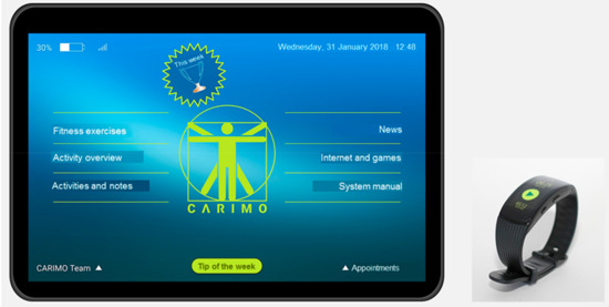 CARIMO consisted of two commercially available hardware components: (1) a tablet (Galaxy Tab A 2016, Samsung Electronics Co., Ltd., 129, Samsung-ro, Yeongtong-gu, Suwon-si, Gyeonggi-do, Korea) and (2) a bracelet with a fitness/activity tracker (Gear Fit2, Samsung Electronics Co., Ltd., 129, Samsung-ro, Yeongtong-gu, Suwon-si, Gyeonggi-do, Korea) (see Figure 1). Both components were selected according to predefined criteria. For the tablet these were: (i) display size of at least nine inches (aspect ratio of 16:10 or 16:9), (ii) Android 5 or higher, (iii) 3G or 4G internet connection, and (iv) a maximum price of EUR 320. The main criteria for the activity tracker were: (i) battery life of three to five days without using GPS, (ii) standalone operating mode (no permanent contact with a paired smartphone or tablet needed), (iii) waterproof or at least splash proof, (iv) adaptable UI and data transfer via Bluetooth or Adaptive Network Topology (ANT), and (v) maximum price of EUR 200. More details on the selection process for the fitness/activity tracker can be found in Willner et al. [34].