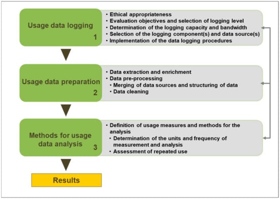 A general methodology, for instance, for web search transaction log analysis [42], is not available for usage data evaluation. Thus, based on the methodology proposed for web search transaction log analysis [42], the proposed usage data evaluation framework aims to ensure a systematic, comparable, and reproducible approach by addressing: (i) usage data logging, (ii) usage data preparation, and (iii) methods for usage data analysis of applications in the field of AAL (Figure 2). Iterations between the successive steps allow for going back to the previous step for revising previous decisions and refining the results. The framework also considers that usage can be measured and analyzed in various ways by offering different options for measurement and analysis.