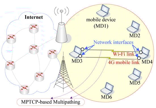 The MPTCP is an extension to traditional single path TCP that enables a multihomed device to allocate data traffic across multiple independent end-to-end paths concurrently through multiple network interfaces [8]. Figure 1 presents a typical MPTCP based multipath communication scenario that involves two multihomed Mobile Devices (MD3 and MD4), which communicate with each other by using both the Wi-Fi and 4G mobile links simultaneously. Such a multipathing feature would be beneficial to the mobile devices to aggregate bandwidth, increase throughput, and enhance communication robustness [9]. Furthermore, MPTCP inherits the standard socket Application Programming Interfaces (APIs) from TCP, which means an MPTCP based device can initiate and establish an MPTCP connection with other devices without making any modifications to today’s Internet applications [10]. With its multipath transmission and backwards compatibility features, the MPTCP is being considered as a preferred transmission technology for data delivery over the current and future Internet [11].