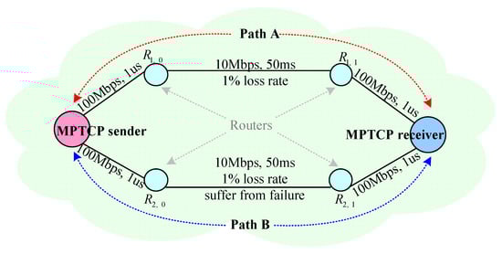 To achieve the above purposes, we implemented a sample dual dumbbell network topology in Network Simulator 2 Version 2.35 (NS-2) [25], in which the MPTCP module [26] was included. The network topology is shown in Figure 2. An MPTCP sender and an MPTCP receiver were connected to each other through two independent end-to-end paths (A and B). The propagation delay of the edge links between the sender (or the receiver) and the routers was set to one microsecond with 100 Mbps of bandwidth. The bottleneck link between and ( and ) was set with a 10 Mbps bandwidth and a 50 milliseconds propagation delay. Path B failed after 30 s of simulation time (we simulated Path B failure by bringing down the bottleneck link between routers and ). The total simulation time was 120 s with infinite FTP flows. Table 1 shows the parameters used in the simulations. Moreover, we performed two test cases named Case 1 and Case 2, which were examined as follows to investigate the effect of path transmission stability differences on the performance of MPTCP.