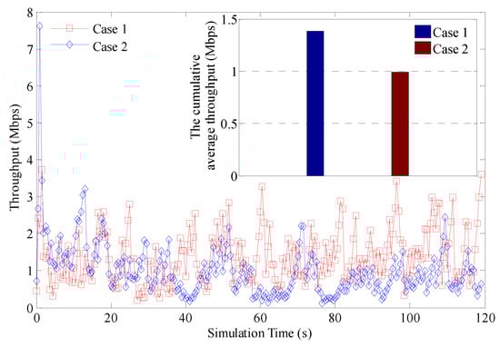 However, MPTCP + (PU)M performed worse than MPTCP-LM because more out-of-order data reception in MPTCP + (PU)M required increased reordering than MPTCP-LM. Moreover, in MPTCP + (PU)M, the paths used in multipath transmission often changed, and as a result, the data traffic could be offloaded from one path to another frequently, which incurred additional processing time overhead. When comparing the three methods in terms of the cumulative average delay (with a total of 100 s of simulation time), the MPTCP-LM scheme’s cumulative average delay was approximately 4.35% lower than that of the baseline MPTCP and 1.03% lower than that of MPTCP + (PU)M.