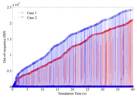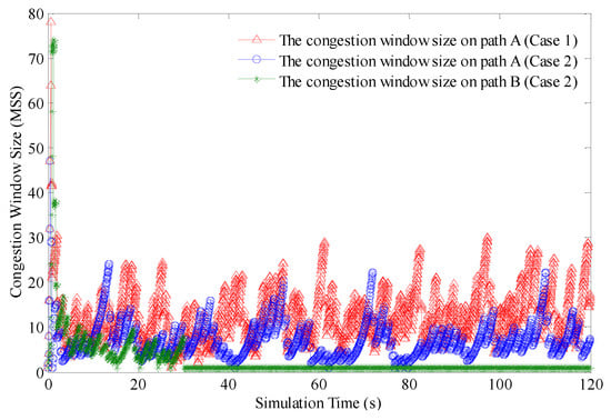 Figure 3, Figure 4 and Figure 5 illustrate the performance comparisons in terms of throughput, congestion window (cwnd), and out-of-order Data Sequence Number (DSN) when Case 1 and Case 2 were executed, respectively. As Figure 3 shows, compared with the MPTCP’s throughput in Case 1, the MPTCP’s throughput in Case 2 was gradually lowered from the former (before 30 s of simulation time) to backward (after 30 s of simulation time) due to failure on Path B. When a failure occurred on Path B from the 30th s, it caused back-to-back timeouts on Path B (see Figure 4; the cwnd size on Path B was always set to one after 30 s). As in the failure case, the MPTCP sender tried to transmit data after each of these timeouts on Path B (namely, unnecessary retransmission via the failure path [27]). The resulting receiver buffer blocking in MPTCP, with a great number of out-of-order data (see Figure 5) held in the constrained receiver buffer, prevented the efficient use of Path A for data transmission and resulted in serious throughput performance degradations.
