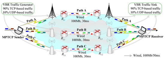 In the past several years, wireless communications systems and networks have experienced a dramatic development [1]. These dramatic advances in wireless communications and networking technologies provide ubiquitous Internet connectivity to a mobile user [2]. Moreover, promoted by the increasing popularity of various wireless networks, mobile devices (i.e., smart phones, laptop computers, and netbooks) are already embedded with multiple Wireless Network Interface Cards (WNICs) and enabled multiple IP features [3,4]. With the multiple IP features (also known as multihoming), the devices can connect to the Internet via multiple IP addresses to provide enhanced and reliable Internet connectivity; they also can simultaneously use several IP addresses to spread data across several end-to-end IP paths. For example, the Apple iOS based products (i.e., iPhone and iPad) [5] and Samsung Galaxy mobile phones (i.e., S9 and S9 Plus) [6] can use both the Wi-Fi and cellular network links to download large files. Such multihomed devices can speed up the transmission data rate and increase their throughput performance by making use of multiple wireless network links simultaneously, enabled by the emerging Multipath TCP (MPTCP) technology [7].