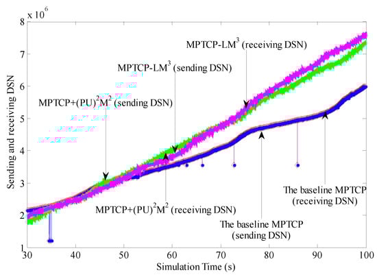 (1) Sending and receiving data DSN: Figure 8 shows the comparison results of data sending and receiving times when the baseline MPTCP, MPTCP + (PU)M, and MPTCP-LM were used, respectively. In order to better illustrate the comparison, the results between t = 30 s and t = 100 s are illustrated (including the no path failure phase (between 30 s to 50 s) and path failure phase (after 50 s)), representative for all the simulation results. From the figure, we can observe that between 30 and 50 s of simulation time, MPTCP-LM and MPTCP + (PU)M performed at a lower level of data sending and receiving times than the baseline MPTCP. This was because the baseline MPTCP fully utilized the three paths for data transmission (Path C was available and reused in multipath transmission after 30 s). In both MPTCP-LM and MPTCP + (PU)M, Path C may be prevented from multipathing due to the quality gap (compared with Paths A and B).