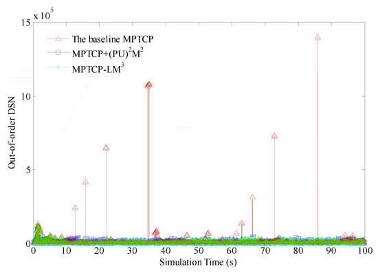 (2) Out-of-order DSN: The Out-Of-Order DSN (OOO DSN) is a good metric to select for studying and analyzing the performance of multipath protocols. The OOO DSN can be attained by the offset between the DSNs of two consecutively received MPTCP data chunks (the difference between the DSN of the current MPTCP chunk and that of the latest received MPTCP chunk). Figure 9 shows a comparison of out-of-order chunks among the baseline MPTCP, MPTCP + (PU)M, and MPTCP-LM. As the figure shows, the baseline MPTCP scheme generated more out-of-order chunks and required increased unnecessary packet reordering than both MPTCP + (PU)M and MPTCP-LM. This was because the baseline MPTCP’s scheduler assigned data traffic over all the paths, without considering that a poorly performing path or a failure prone path would cause extremely great numbers of out-of-order chunks for reordering.