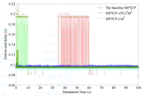 Besides, we can also see that between 50 and 70 s of simulation time, MPTCP + LM achieved a lower level of data sending and receiving times than the MPTCP + (PU)M scheme. This was because MPTCP + LM detected path failures based on the counts of receiver buffer blocking, while MPTCP + (PU)M was based on the path’s delay variations, which means MPTCP + LM could possibly find out and prevent the usage of a broken path or a poorly performing path more slowly than MPTCP + (PU)M. However, in MPTCP + (PU)M, a path could be removed/reconnected frequently if its delay performance was getting worse accidentally or suddenly. This limitation made MPTCP + (PU)M not able to provide stable transmission efficiency and perform worse than MPTCP + LM in the rest of the simulation time (between 70 and 100 s).