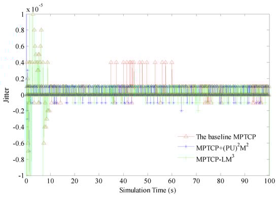 (4) Jitter comparison: Jitter can be defined as the amount of packet delay variation in the end-to-end data traffic transmission time. Jitter is a well suited metric to evaluate and analyze the temporal performance of a multipath transmission protocol. A higher level of jitter is more likely to occur on a poorly performing transport technology and vice versa. Figure 11 shows a comparison of the jitter performance when the three schemes were used. Although the path management behaviors of both MPTCP-LM and MPTCP + (PU)M (removing or reconnecting a path in multipath transmission) influenced the jitter performance, which was occasionally less than that of the baseline MPTCP, we argue that this was acceptable and worthy of achieving high level performance since MPTCP-LM and MPTCP + (PU)M could adaptively select appropriate paths for multipathing. In contrast, the baseline MPTCP, as previously mentioned, was bound to out-of-order data reception (due to path quality characteristics) and unnecessary retransmission (due to path failures), resulting in a lower quality of service than both MPTCP-LM and MPTCP + (PU)M.