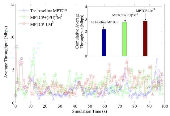 In order to illustrate the throughput comparison better, we calculated the cumulative average throughput of the three schemes respectively, by averaging the total average throughput values in a total of 100 s of simulation time. The subfigure in Figure 12 shows a comparison of cumulative average throughput when the three schemes were used, respectively. As the subfigure shows, MPTCP-LM performed the best among the three schemes compared. However, it is noteworthy that the cumulative average throughput of MPTCP-LM was about 2.8 Mbps, which corresponded only to 12% of the aggregated bandwidths of the three access links (10 Mbps + 11 Mbps + 2 Mbps = 23 Mbps). We argue that this phenomenon was caused by several reasons: (i) the VBR competing traffic could consume a certain amount of each path’s access bandwidth; (ii) the two wireless loss models attached to each of the three access links could lead to the degradation of MPTCP throughput performance; (iii) the path failures on Path C will inevitably caused transmission interruption in Paths A and B and, thus, lowered the MPTCP throughput performance; and (iv) the out-of-order data arrival would actually degrade the performance in most cases because of the path quality differences. Still, the MPTCP-LM scheme’s cumulative average throughput was 27.97% higher than that of the baseline MPTCP and 3.68% higher than that of MPTCP + (PU)M.