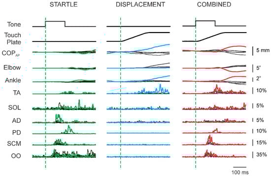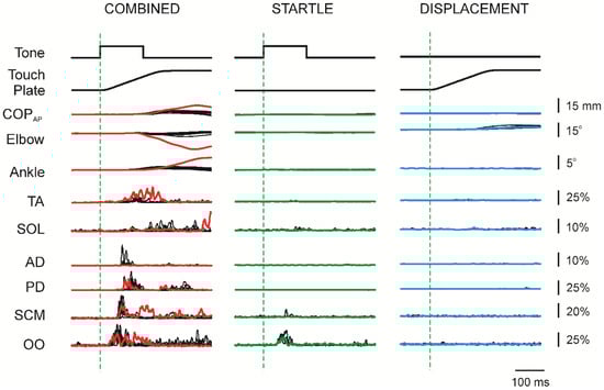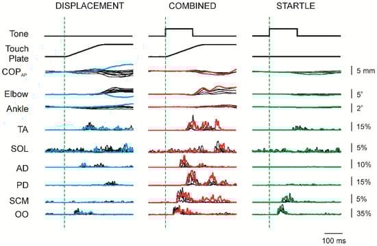 Sample data traces from a single participant who received the COMBINED stimuli initially. Each cluster of traces represents the complete series of trials for that stimulus mode, with the coloured traces representing the first trial for that stimulus mode (Red, COMBINED; Green, STARTLE; Blue, DISPLACEMENT). The thin black lines of each cluster represent the subsequent trials. The vertical dashed line is aligned to the onset of the stimuli. Positive deflections in the COPAP traces represent forward, elbow traces represent extension, and ankle traces represent plantarflexion. COPAP, center of pressure anterior–posterior; TA, tibialis anterior; SOL, soleus; AD, anterior deltoid; PD, posterior deltoid; SCM, sternocleidomastoid; OO, orbicularis oculi.