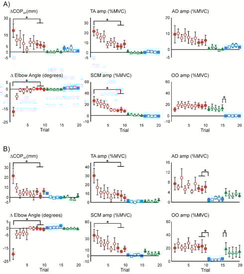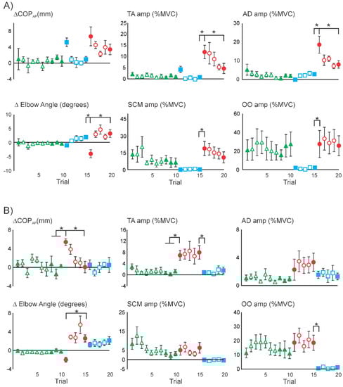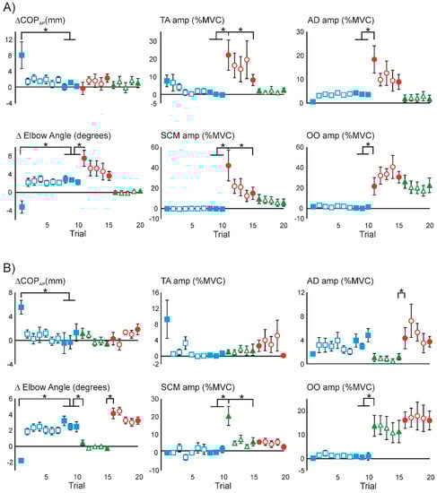 Trial-by-trial mean (SE) mechanical and muscle response amplitudes for participants who habituated to the COMBINED stimuli initially. (A) Participants subsequently received the STARTLE stimuli, followed by the DISPLACEMENT. (B) Participants subsequently received the DISPLACEMENT, followed by the STARTLE. Asterisks indicate differences identified by Tukey’s HSD comparisons (p < 0.05). Blue squares, DISPLACEMENT; Red circles, COMBINED; Green triangles, STARTLE. Closed symbols indicate data points used in the statistical analysis. TA, tibialis anterior; AD, anterior deltoid; SCM, sternocleidomastoid; OO, orbicularis oculi; COPAP, center of pressure anterior–posterior; MVC, maximum voluntary contraction.