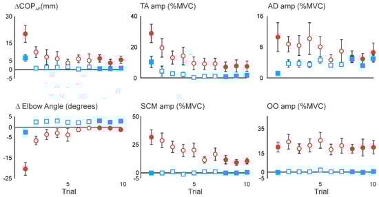 Trial-by-trial mean (SE) mechanical and muscle response amplitudes for all participants who received DISPLACEMENT (Blue squares) and COMBINED stimuli (Red circles) initially. Closed symbols indicate data points used in the statistical analysis. TA, tibialis anterior; AD, anterior deltoid; SCM, sternocleidomastoid; OO, orbicularis oculi; COPAP, center of pressure anterior–posterior; MVC, maximum voluntary contraction.