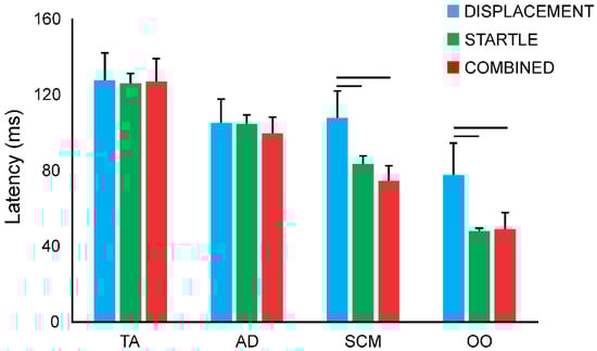 Mean (SE) onset latency for responses evoked in the respective muscle across all stimuli of the specific mode. Horizontal lines connect differences identified by Bonferroni adjusted, post hoc t-tests (p < 0.05). TA, tibialis anterior; AD, anterior deltoid; SCM, sternocleidomastoid; OO, orbicularis oculi.